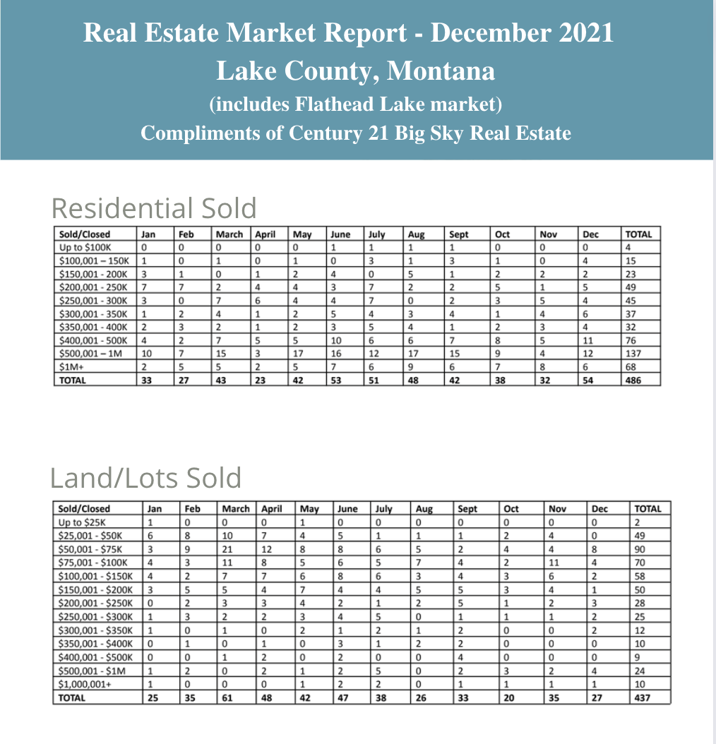 Click on Read More to view the Lake County Montana Real Estate Market Report for December 2021.  See the number of homes and lots that sold each month of this year by price range.